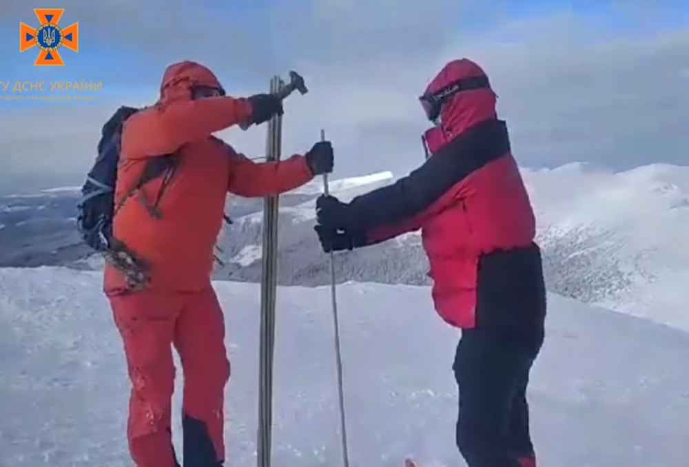 Прикарпатські рятувальники спільно з волонтером туристичного притулку "Смотрич" встановлюють стовпці для орієнтування під час зимових походів,а також таблички з інформацією про ділянки із загрозою лавинонебезпечності.