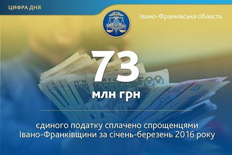 Як повідомили в Головному управлінні ДФС в Івано-Франківській, протягом січня-березня 2016 року платники податків, які застосовують спрощену систему оподаткування, сплатили до бюджету 73,2 млн. грн. єдиного податку.