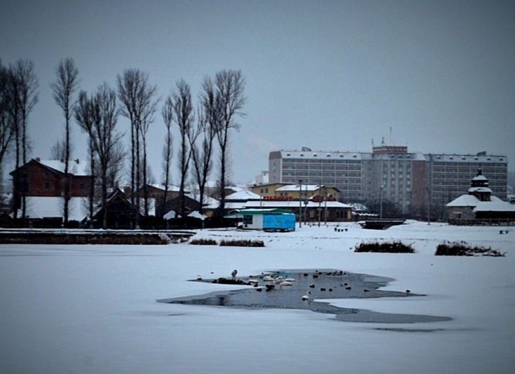 Водойма вже практично вся вкрилася льодом, тільки посередині залишилося невелике вікно, в якому скупчилися птахи.