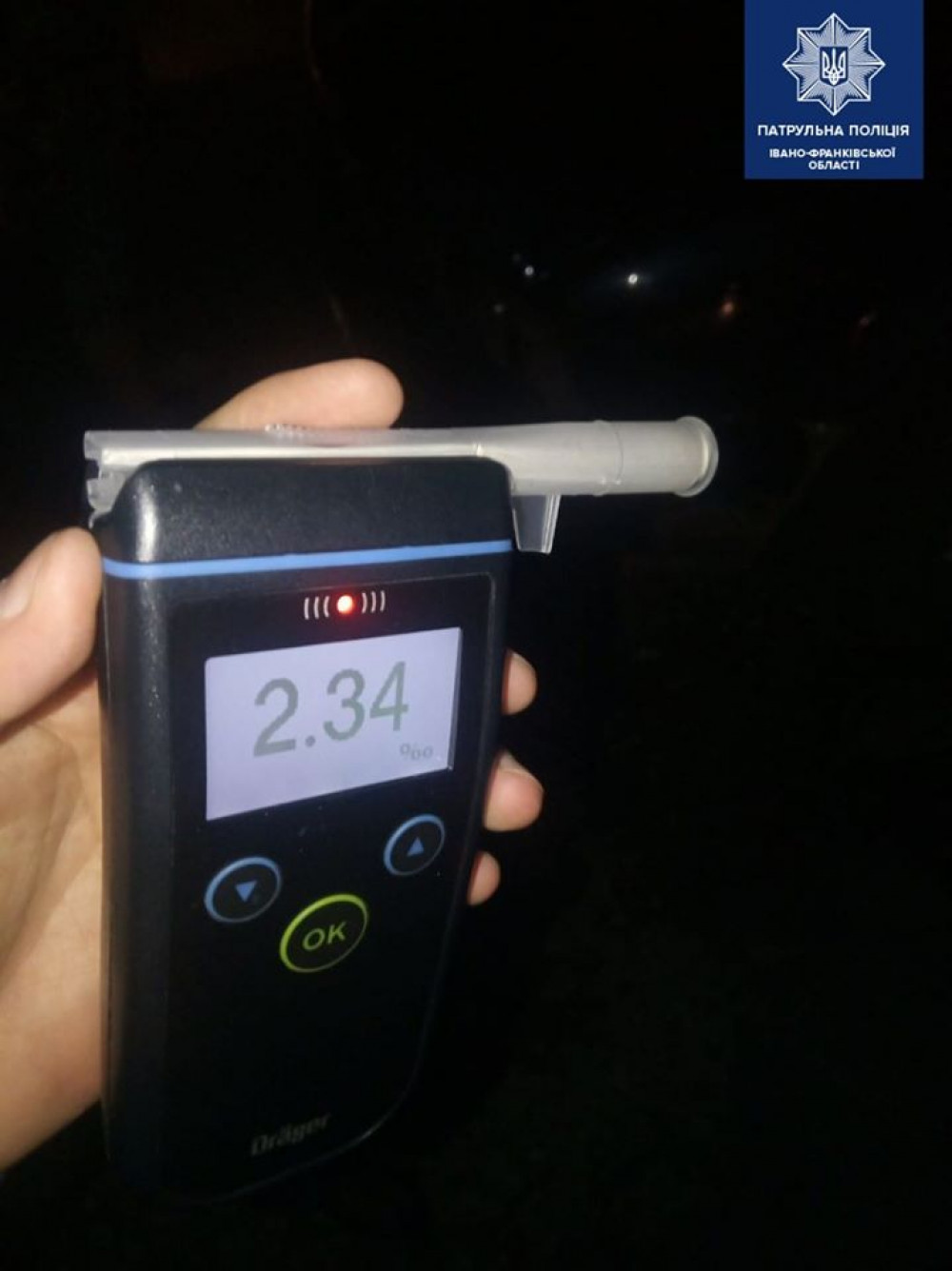 Під час спілкування з водієм, патрульні помітили в останнього явні ознаки алкогольного сп'яніння. Чоловік погодився пройти огляд на стан сп'яніння на місці. Результат тесту виявився позитивним — 2.34 проміле алкоголю в організмі, пише пресслужба патрульної поліції Івано-Франківської області.