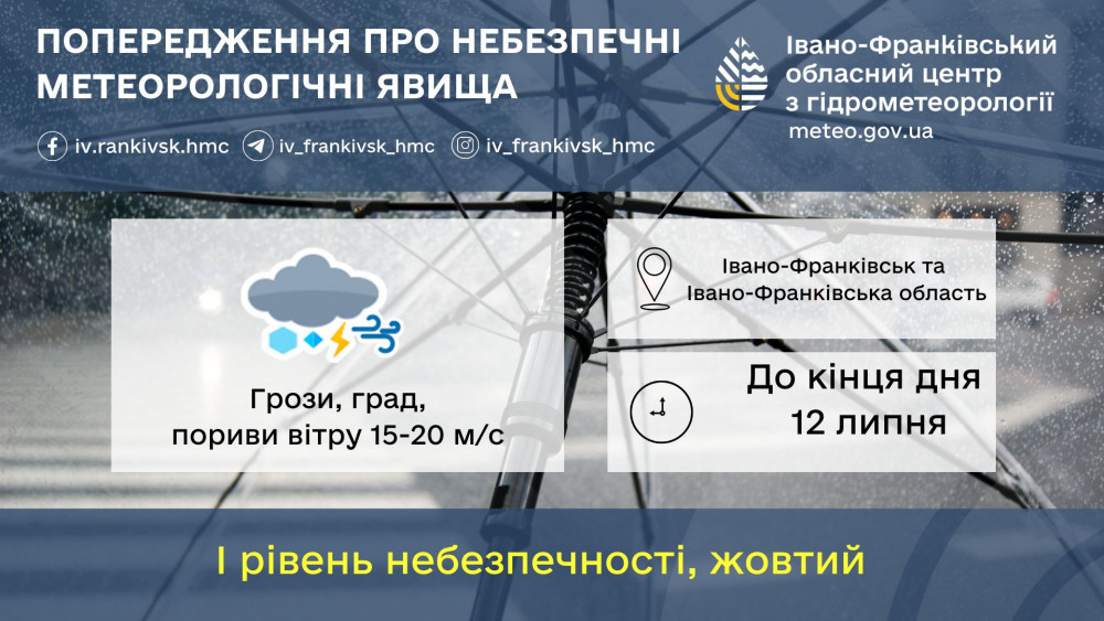 "Попередження про небезпечні метеорологічні явища. До кінця дня 12 липня по місту Івано-Франківську та області грози, град (6-19мм), пориви вітру 15-20 м/с. (1 рівень небезпечності, жовтий)",- йдеться у повідомленні.
