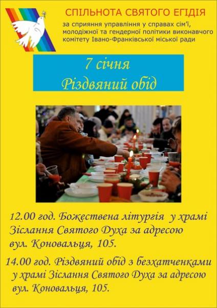 Починаючи з 7 січня 1999 року, друзі Спільноти Святого Егідія у Києві накривають святковий стіл для бідних людей міста: людей без дому, літніх, дітей, бідних родин. До обіду приєднуються сотні людей у скруті і багато киян, що вирішили відсвяткувати Різдво у найкращий спосіб.
