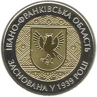 На реверсі монети зображено герб області, по колу розміщено написи: Івано-Франківська область (угорі), заснована у 1939 році.