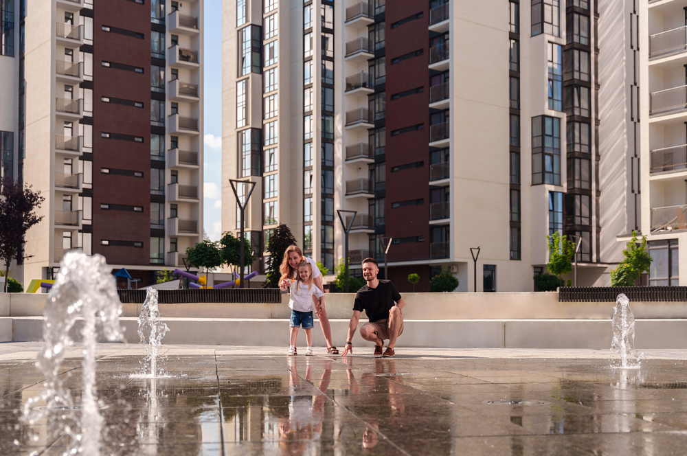 Родзинка житлового комплексу – інтерактивний сухий фонтан з підсвіткою. Поруч забудовник облаштував амфітеатр – тут мешканці зможуть спостерігати за грою води, спілкуватися та проводити затишно вечори.