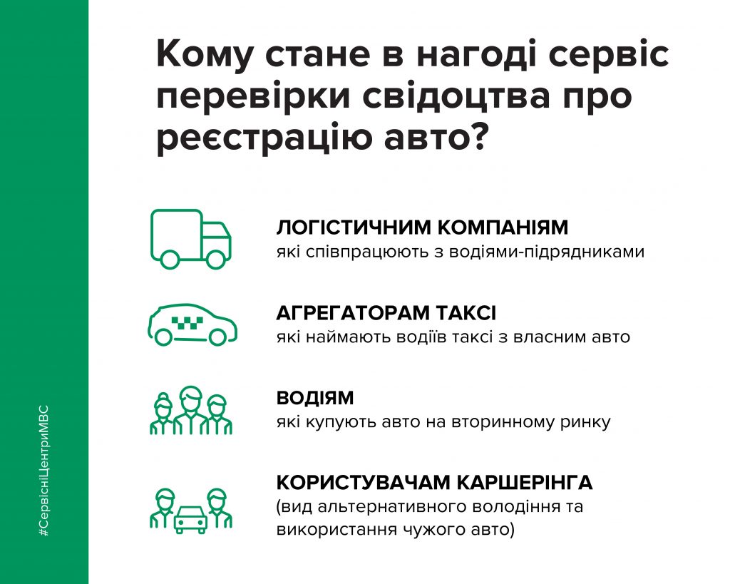 «Ми раді запропонувати сервіс, який буде корисний не тільки громадянам, але і бізнесу. Можливість самостійно перевірити свідоцтво про реєстрацію транспортного засобу може убезпечити ринок від шахрайства при отриманні транспортних послуг, при найманні працівників на роботу, каршерінгу та купівлі авто тощо», – наголосив начальник Головного сервісного центру МВС Владислав Криклій.