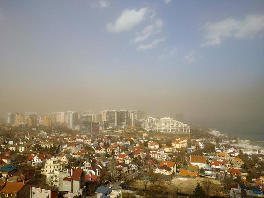 Вітер з поривами до 25 метрів приніс пісок з узбережжя Чорного моря. Жителі Одеси відзначають, що видимість скоротилася до кількох метрів.