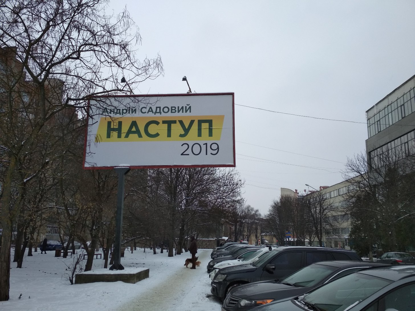 Спостерігачі ОПОРИ в Івано-Франківській області 10 та 11 січня зафіксували білборди із написом «Андрій Садовий. Наступ 2019» з ознаками агітації, але без передбачених законодавством вихідних даних.