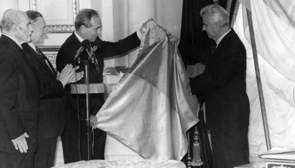 22 серпня 1992 р. в Маріїнському палаці в Києві урочисто було передано рельєфну печатку УНР як символ влади, клейнод гетьмана Івана Мазепи – знак влади президентів УНР в екзилі, синьо-жовтий прапор, який використовувався урядом УНР в еміграції, Грамоту про припинення діяльності УНР та Заяву про правонаступництво України від УНР.