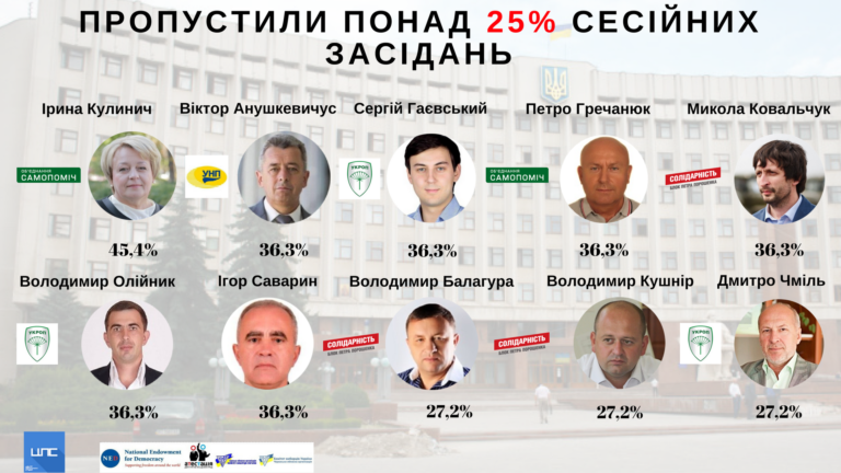 По 4 засідання пропустили депутати від УКРОПу Володимир Олійник, та Сергій Гаєвський, екс-УКРОПівець Ігор Саварин, представник БПП “Солідарність” Микола Ковальчук та Петро Гречанюк з “Самопомочі”. По 3 сесійних засідання з 11-ти пропустили Володимир Балагура, Володимир Кушнір з БПП “Солідарність” та Дмитро Чміль з УКРОПу.