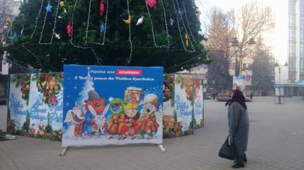На Вічевому майдані в Івано-Франківську просто під головною ялинкою міста встановили святковий новорічний щит із політичною рекламою.