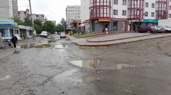 Мешканка вулиці Хоткевича скаржиться, що після грози по дорозі можна пройти хіба в рибацьких чоботах.