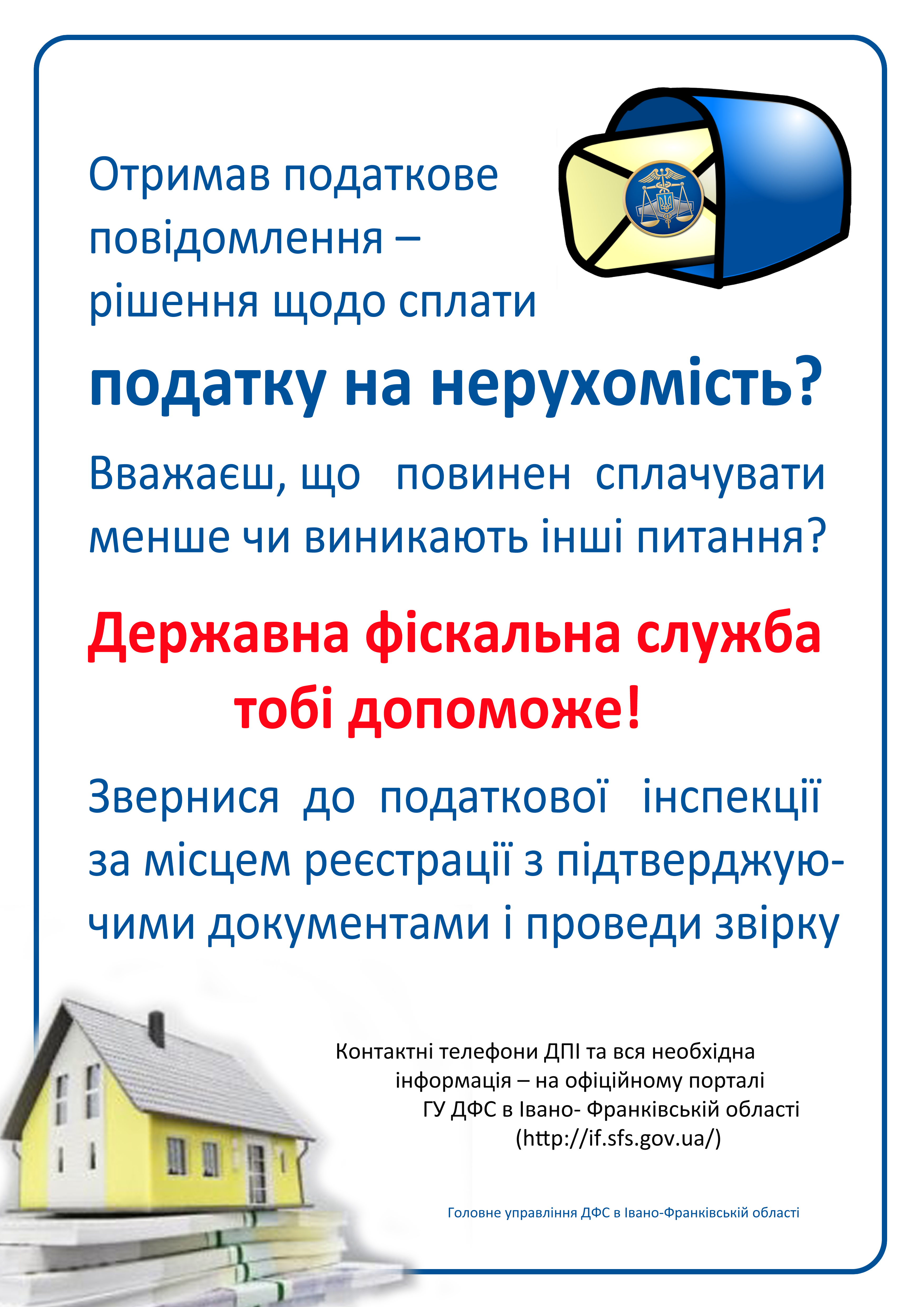 Громадяни, які отримали податкові повідомлення-рішення про сплату податку на нерухоме майно, відмінне від земельної ділянки, у випадку незгоди з нарахованими сумами мають можливість звернутись до органу Державної фіскальної служби та провести звірку даних.