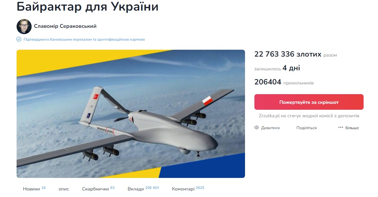 У Польщі зібрали 22,7 млн злотих (близько $4,7 млн) на купівлю ударного безпілотника Bayraktar для української армії.