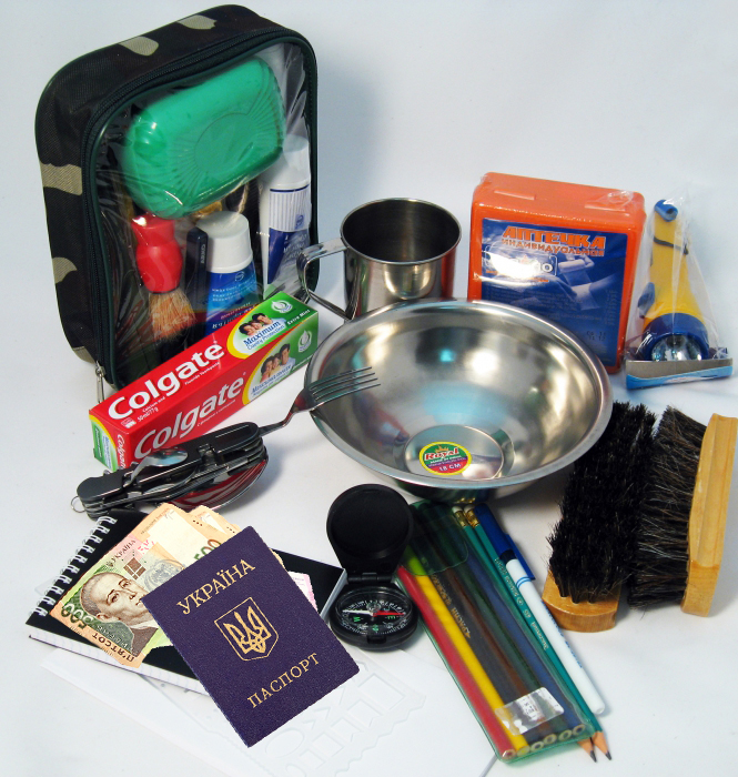 - засоби гігієни: зубна щітка і зубна паста, невеликий шматок мила, рушник (є такі в упаковці пресовані), туалетний папір, кілька упаковок одноразових сухих та вологих серветок, кілька носових хусток, засоби інтимної гігієни, бритву, манікюрний набір;