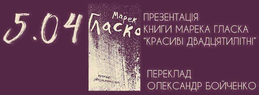 5 квітня о 18.30 у галереї-книгарні «Під Лиликом» (вул. Шевченка, 12), презентація українського перекладу автобіографічного роману Марека Гласка "Красиві двадцятилітні" ("Видавництво 21").