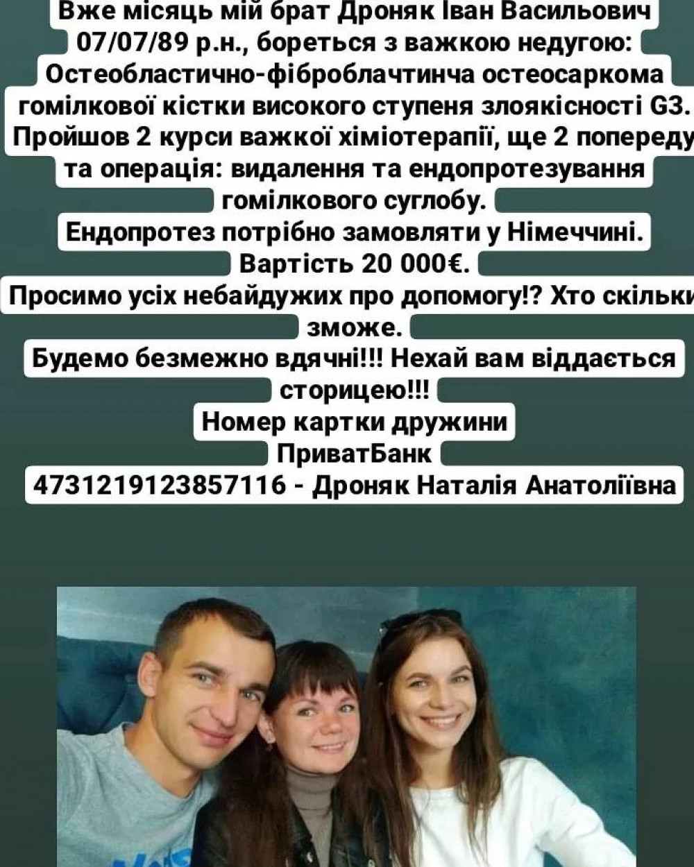 "Люди добрі, допоможіть!!! Вже місяць мій брат Дроняк Іван Васильович 07/07/89 р.н., бореться з важкою недугою: Остеобластично-фіброблачтинча остеосаркома гомілкової кістки високого ступеня злоякісності G3. Пройшов 2 курси важкої хіміотерапії, ще 2 попереду і за місяць операція: видалення та ендопротезування гомілкового суглобу. Ендопротез потрібно замовляти у Німеччині. Вартість 20 000€. Просимо усіх небайдужих про допомогу! Хто скільки зможе. Будемо безмежно вдячні. Нехай вам віддається сторицею",- просить сестра Івана Irina Dronyak.