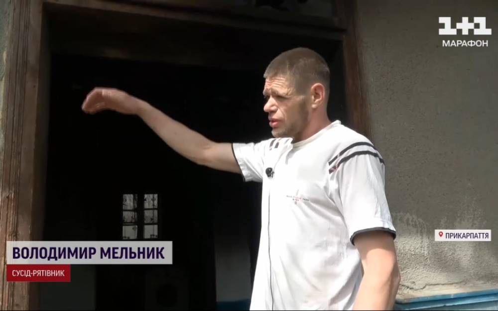 "Полум'я і дим вже такі були, що я не годен був зайти. То я пішов туди, вирвав, вибив раму з вікон. Я не знав просто, де дитина знаходиться, поставив сюди відро, аби заскочити. Обмотався, заліз. Вона отут в самому кутику лежала", - каже сусід-рятувальник Володимир Мельник.