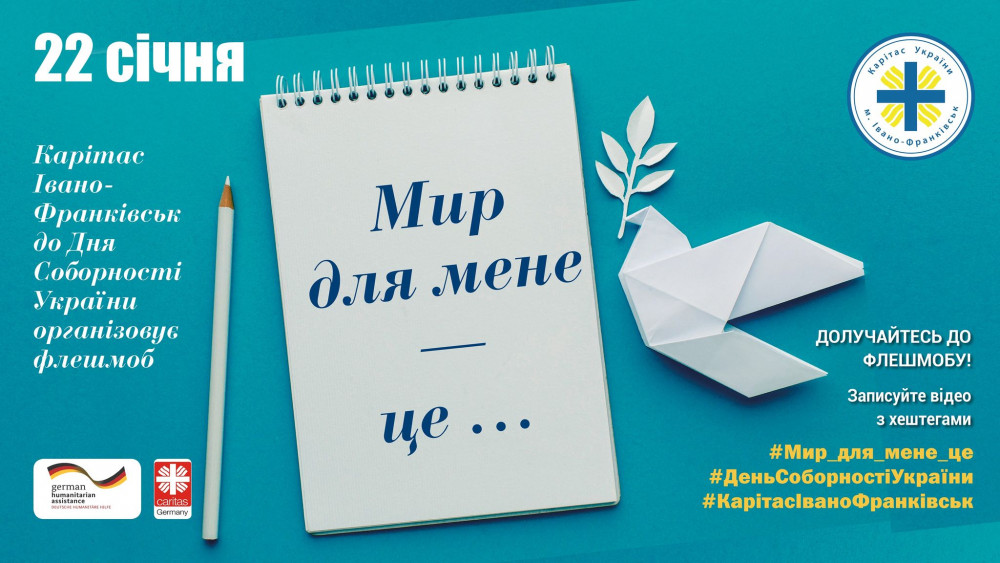 "А що для вас означає МИР? Долучайтесь до флешмобу! Записуйте відео з хештегами #Мир_для_мене_це #ДеньСоборностіУкраїни #КарітасІваноФранківськ та надсилайте у месенджер на сторінку Карітасу. До флешмобу Карітас Івано-Франківськ залучив духовенство різних конфесій Івано-Франківщини, представників місцевої влади, людей різних сфер діяльності – журналістів, поліцейських, медиків; учасників АТО та їх родини, сім'ї загиблих воїнів АТО/ООС, внутрішньо переміщених осіб та відомих франківців. Флешмоб організовується в рамках проекту "Долаючи розломи у громадах, що постраждали від конфлікту від зцілення до співпраці" за фінансової підтримки Міністерства закордонних справ Німеччини та Карітасу Німеччини", - йдеться у дописі.
