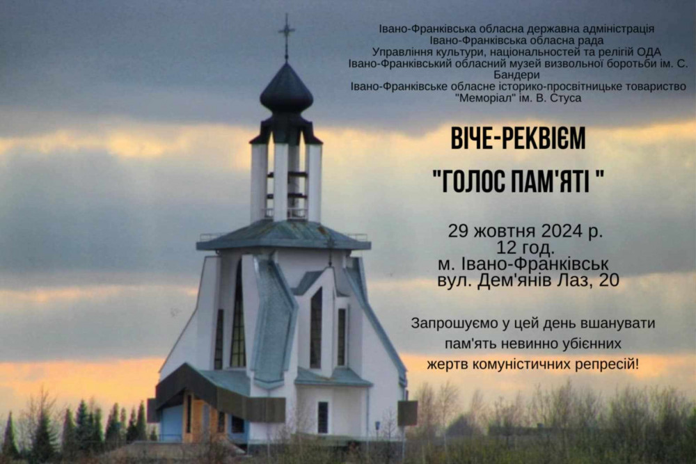 Прикарпатців закликають долучитися до віче-реквієму "Голос пам'яті", яке відбудеться 29 жовтня 2024 р. о 12-ій годині на території Меморіального комплексу "Дем'янів Лаз" та вшанувати пам'ять жертв радянського тоталітарного режиму.