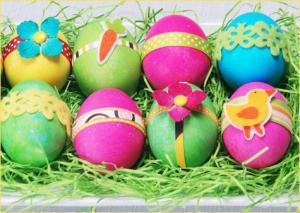 Яйця — можна дерев'яні, можна просто шкаралупу від яєць — пофарбувати акриловою фарбою в один колір. Вирізати з паперу вподобані фотозображення або просто реалістичні ілюстрації квітів, листя, птахів (у цьому випадку треба працювати акуратно, ретельно вирізаючи деталі). Акуратно приклеїти і покрити лаком.