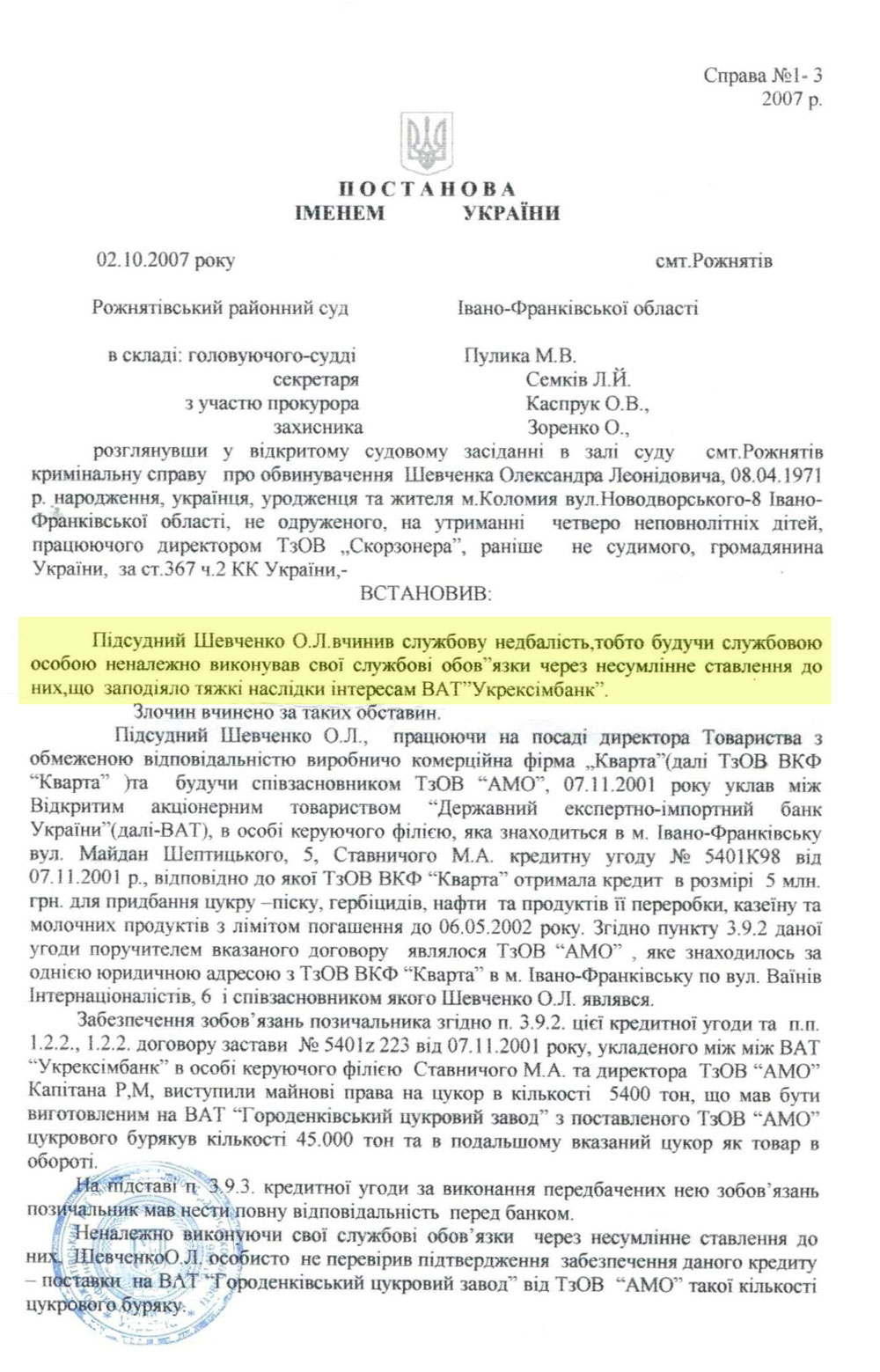 Як йдеться в постанові, підсудний Шевченко О.Л. вчинив службову недбалість, тобто будучи службовою особою неналежно виконував свої службові обов’язки через несумлінне ставлення до них, що заподіяло тяжкі наслідки інтересам ВАТ “Укрексімбанк” на суму понад 6,5 млн. грн.