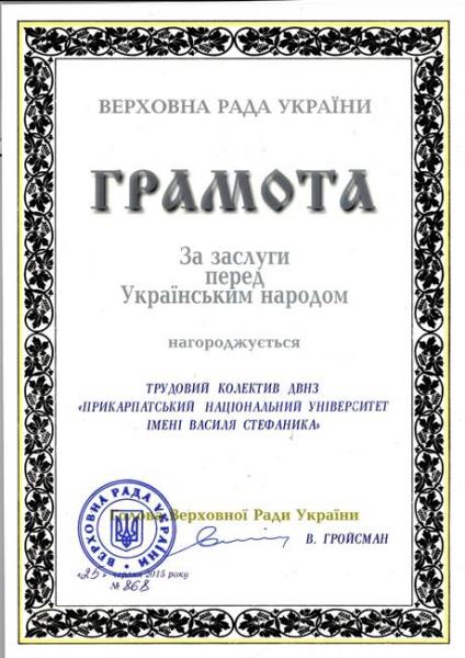 За вагомий внесок у розвиток освіти і науки, підготовку висококваліфікованих фахівців та з нагоди 75-річчя створення Прикарпатського національного університету імені Василя Стефаника трудовий колектив закладу нагороджено Грамотою Верховної Ради України «За заслуги перед Українським народом».