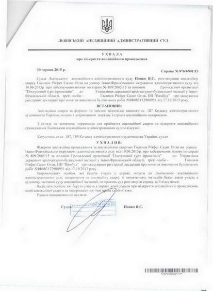 Судова справа за адміністративним позовом ГО "Поступовий гурт франківців" до Управління державної архітектурно-будівельної інспекції в Івано-Франківській області (треті особи в цій справі - Гасимов Ріяфет Садиг Огли та ПП "ВАМБУД") про скасування реєстрації декларації про початок виконання будівельних робіт отримала продовження.