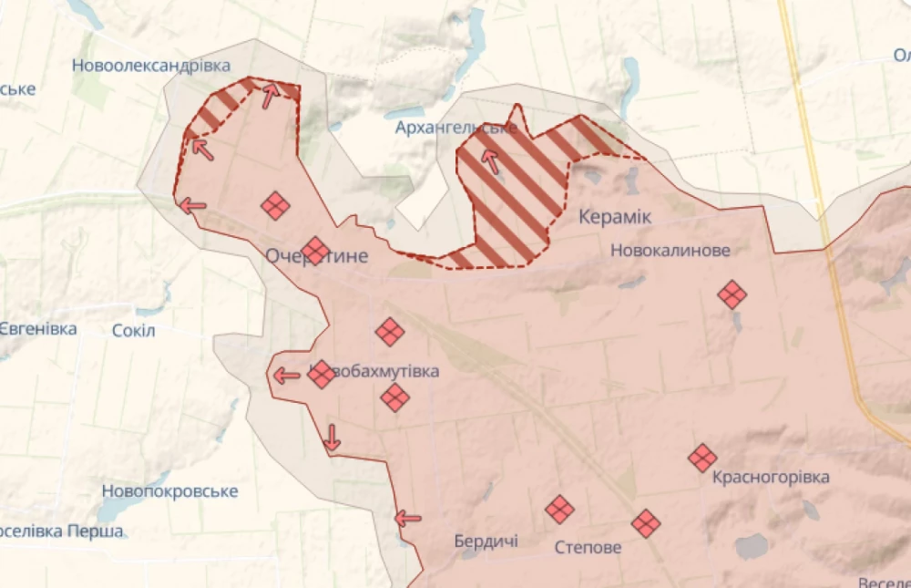 Так, після вчорашнього повідомлення про захоплення окупаційними військами РФ сіл Керамік і Новокалинове Покровського району Донецької області, росіяни просунулися далі в бік села Архангельське. Судячи з карти аналітиків, ворог уже в межах населеного пункту.