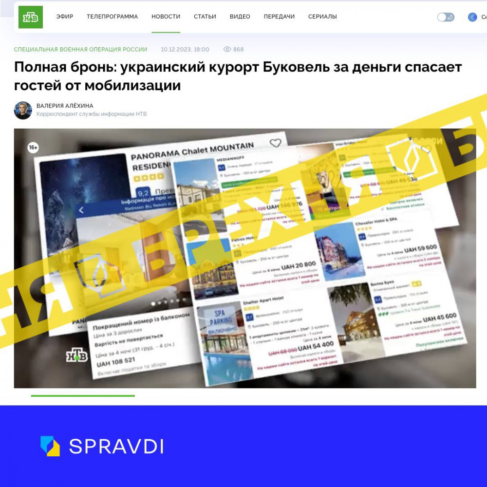 "У Буковелі можна врятуватися від мобілізації за гроші». Це – неправда. Брехня: власники готелів у Буковелі платять співробітникам військкоматів, аби ті не заважали VIP-гостям. Про це пишуть російські ЗМІ", - зазначається у повідомленні.