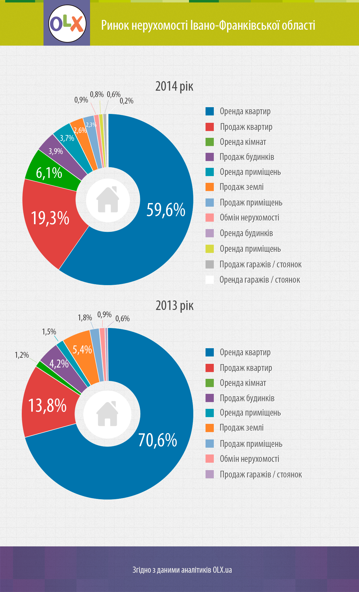 На даний момент на майданчику OLX розміщено біля 30 тис. оголошень щодо продажу та оренди об’єктів житлової та нежитлової нерухомості в Івано-Франківській області. 90% пропозицій (понад 25 тис. оголошень) стосуються міста Івано-Франківська.