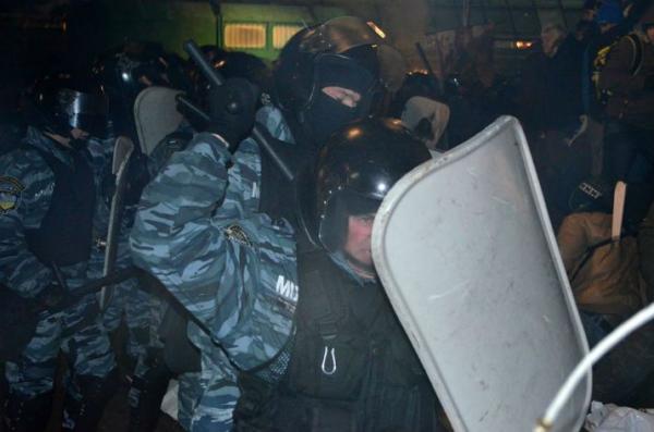 Як відомо, сьогодні вранці “Ягуар” оточив Майдан, “беркутівці” розпочали розгін після 4 ранку, коли тут було кілька сотень людей. “Беркут” бив людей кийками, повалював на землю, заламував руки, люди втікали і ховалися в подвір’ях будинків. Є багато поранених. Деяких активістів забрали до райвідділку.