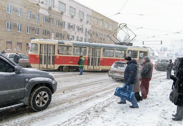 Снігопад у Києві: корки в 8 балів, трамвай злетів з рейок, безліч ДТП
