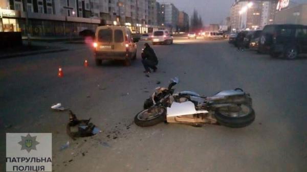 На вулиці Миколайчука водій "Renault Kangoo", виїжджаючи на головну дорогу, не пропустив мотоцикл, який рухався по головній. Аби уникнути зіткнення, мотоцикліст різко загальмував й мотоцикл занесло. Чоловік пошкодив собі лікті рук