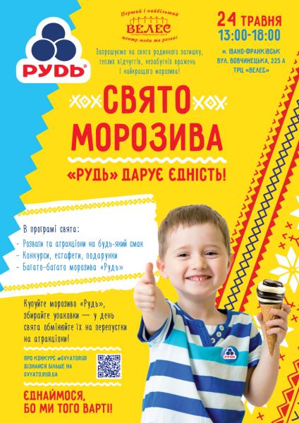 24 травня з 13:00 до 18:00 в Івано-Франківську відбудеться "Свято морозива". У програмі свята: розваги та атракціони на будь-який смак, конкурси, естафети, подарунки та багато-багато морозива від ТМ "Рудь".