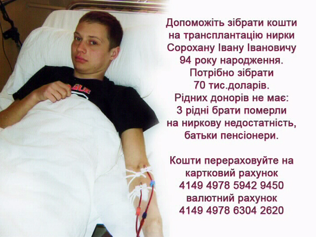 Допомоги потребує 21-річний мешканець Косівщини Іван Сорохан. Хлопцеві потрібно 70 тисяч доларів для пересадки нирки. Таку операцію можна здійснити лише за кордоном, адже рідних донорів у нього немає. Троє рідних братів померли від ниркової недостатності, а батьки вже у поважному віці. У Коломиї організували благодійний концерт, де збирали кошти для Івана.