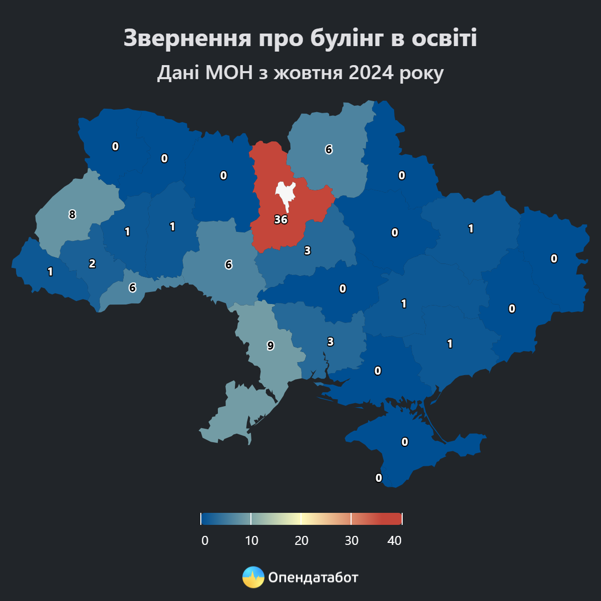 Наприкінці жовтня в Україні запрацювала кнопка для звернень щодо булінгу. За цей час вже подано 85 анонімних повідомлень. За даними Міністерства освіти та науки України, 80% заяв щодо булінгу подаються батьками і лише 20% — дітьми. Цією можливістю вже скористалися у 16 регіонах країни. Переважну більшість заяв було подано у Києві та області: 36 повідомлень. Наслідують Одещина та Львівщина — по 9 та 8 повідомлень відповідно.
