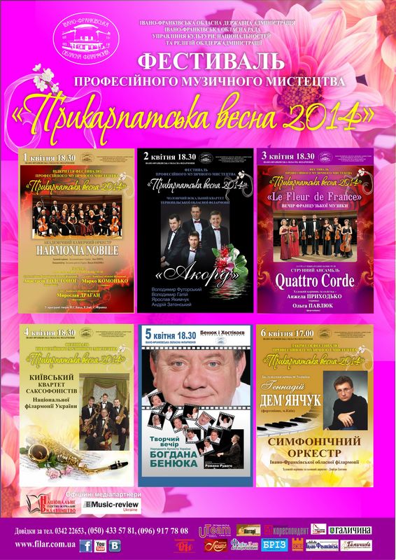 “Фортепіанну мозаїку” подарують лауреати всеукраїнських та міжнародних конкурсів Анастасія Толстоног та Мирослав Драган. А вже завтра гостями “Прикарпатської весни – 2014″ буде чоловічий вокальний квартет “Акорд” з Тернопільщини/