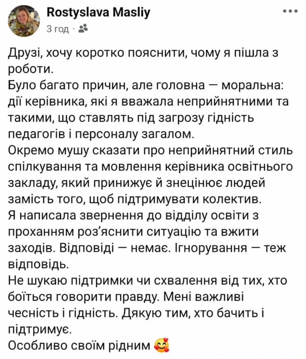 Як розповіла пані Ростислава у розмові з кореспонденткою "Бліц-Інфо", вона написала заяву на звільнення 3 вересня, після чергового приниження на педраді від директорки закладу Надії Канюк.