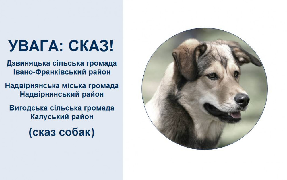 "Івано-Франківською регіональною державною лабораторією Держпродспоживслужби в Івано-Франківській області встановлено сказ домашніх тварин (собак) в населених пунктах Дзвиняцької сільської громади Івано-Франківського району, Надвірнянської міської громади Надвірнянського району та Вигодської сільської громади Калуського району", - зазначається у дописі.
