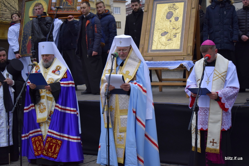 На площі Андрея Шептицького зібралися кілька сотень людей. Митрополити Івано-Франківської єпархії УГКЦ, Івано-Франківсько-Галицької єпархії ПЦУ, Івано-Франківської єпархії ПЦУ, Івано-Франківського деканату Львівської архідієцезії РКЦУ спільно провели молебень за мир в Україні, інформує кореспондентка Бліц-Інфо.
