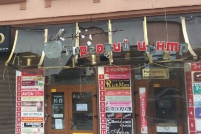 У центрі Івано-Франківська брила льоду впала на навісний дашок входу у ТЦ "Яблуко".