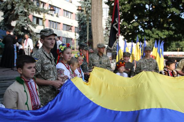 Під звуки національного гімну у виконанні муніципального духового оркестру представники влади, громадськості, військові та діти урочисто підняли на великий флагшток оновлене полотнище державного прапора України.