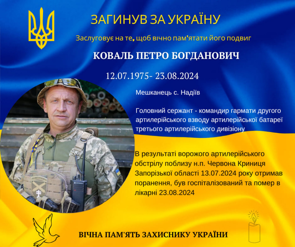Напередодні Дня незалежності у госпіталі помер головний сержант - командир гармати Петро КОВАЛЬ з с. Надіїв Долинської громади.