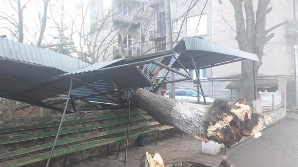 У Коломиї через сильний вітер у вівторок, 1 грудня, дерево впало на автобусну зупинку на вулиці Довбуша.
