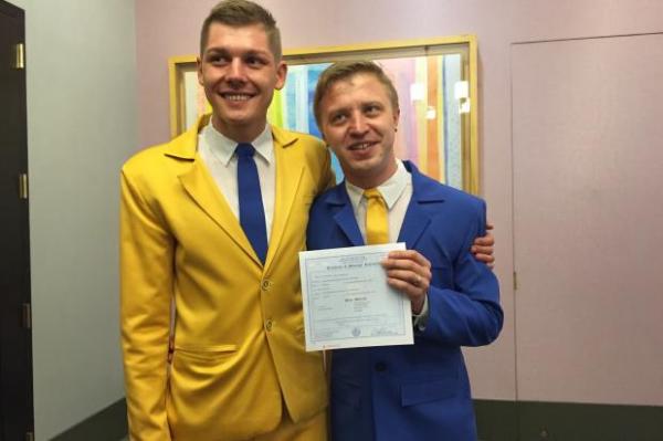 У Нью-Йорку одружилися керівник «Гей-альянсу Україна» Тарас Карасійчук і його супутник життя Микола Маслов, який за сумісництвом також є співробітником організації. Хлопці були одягнені в кольори українського прапора: один — в жовтий костюм і синю краватку, а інший, навпаки, в синій костюм і жовтий галстук.