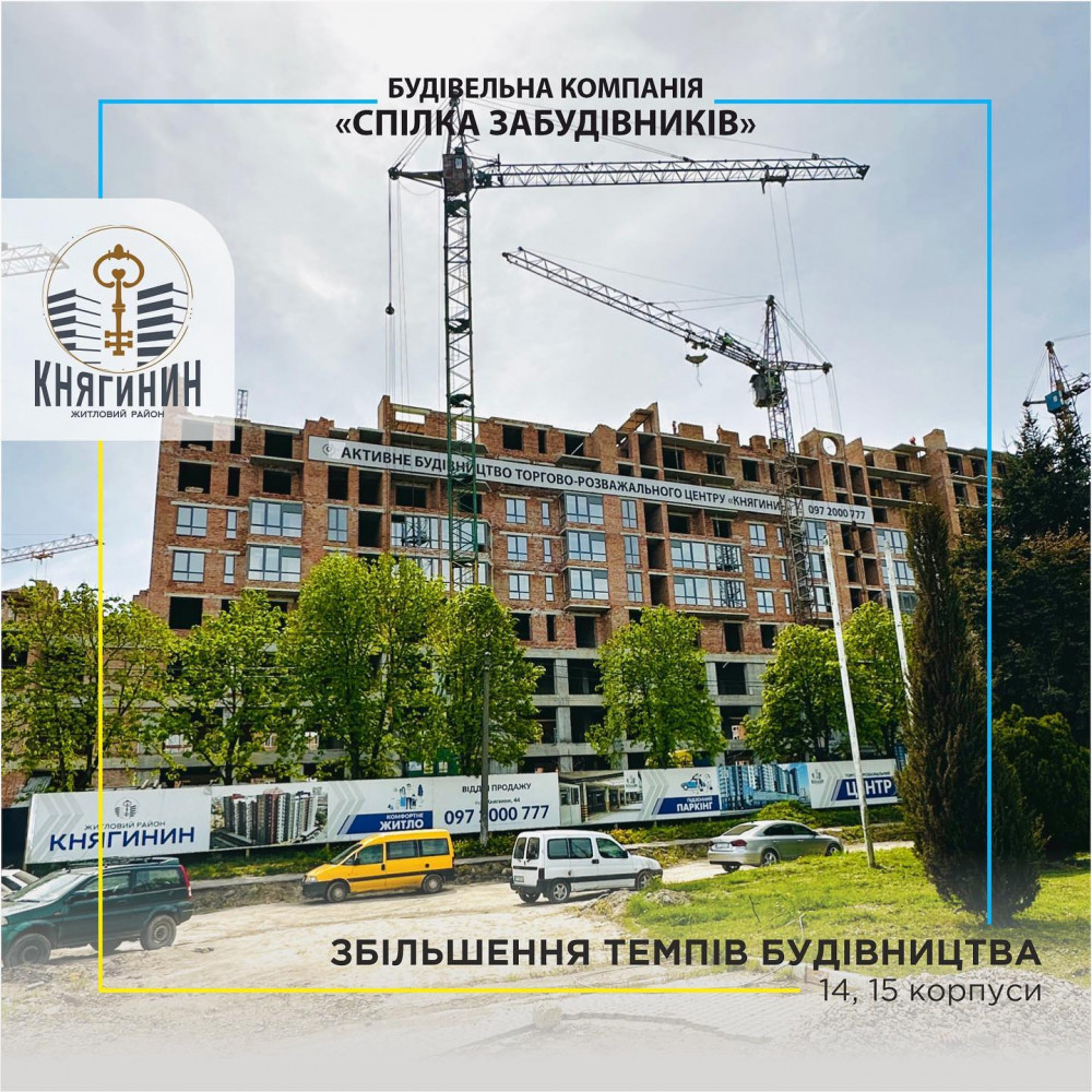 Уже декілька тижнів тут значно збільшені темпи будівництва 14 та 15 корпусів, чотири поверхи яких відведені під ТРЦ “Княгинин”. Для цього суттєво збільшили постачання будматеріалів та час роботи будівельників.