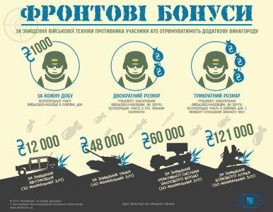 Документом передбачено запровадження додаткової винагороди за знищення військової техніки супротивника. Зокрема, за знешкодження бойового літака виплачуватимуть 121 тисячу гривень, систему залпового вогню − 60 тисяч гривень, тактично-ракетних комплексів – 54 тисячі гривень, за кожен танк – 48 тисяч гривень, об'єкт наземної артилерії та бойову машину піхоти – по 42 тисячі гривень, за кожен знищений переносний зенітно-ракетний комплекс − 30 тисяч гривень.