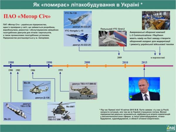 Тим часом, навесні 2015 року президент Росії Володимир Путін під час Прямої лінії заявив, що в Україні масово зупиняються підприємства та що наша держава втрачає позиції у галузі ракето- літако-, суднобудування, в області атомної енергетики, інформує Знай.
