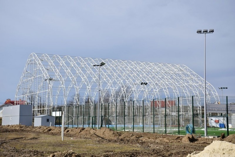 Передбачено тент висотою 18,5 метрів, який буде захищати від атмосферних опадів, чого повністю достатньо для проведення навчально-тренувальних занять та змагань у різну пору. Трибуни, які встановлять навколо поля, розраховані на 296 місць. Також окремо за проектом облаштують адміністративно-господарські приміщення, роздягальні, душові та санвузли. Наразі звели фундамент під опори та металеві конструкції для каркасу. Закінчити проект планують цьогоріч.