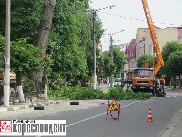 Сьогодні, 22 травня, комунальні служби Івано-Франківська ведуть боротьбу зі старими деревами в центральній частині міста. Зрізають аварійні та потенційно небезпечні дерева і гілки.
